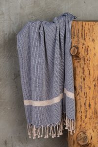 The peshtemal towel’s fabric is made of 100% cotton in manually operated looms in Turkey.